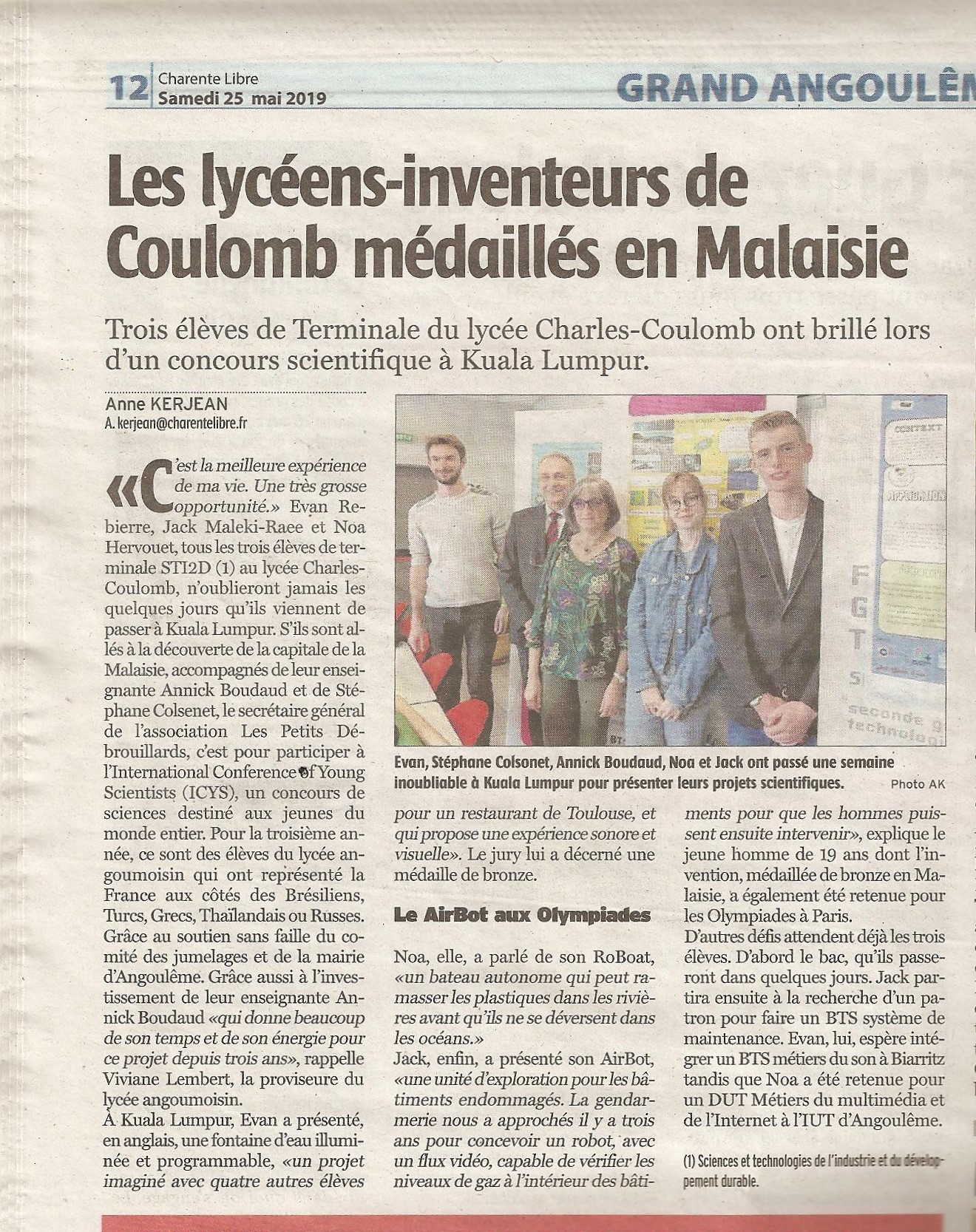Nous avons eu le plaisir d’écouter le récit de leur voyage le 17 mai, lors d’un moment de restitution au Lycée Charles Coulomb, en présence la proviseure, Mme Lembert, et de leur professeure, Annick Boudaud, qui les a préparés aux différentes épreuves de la compétition et les a accompagnés jusqu’en Malaisie. L’association Les Petits Débrouillards, qui a soutenu les élèves dans l’élaboration de leurs projets scientifiques, était représentée par Yannick Delprat, coordinateur départemental, et Stéphane Colsenet, secrétaire général de l’association, qui était lui aussi du voyage. L’Adjointe au Maire au Développement des Arts et de la Culture, Mme Elisabeth Lasbugues, était également présente pour représenter la Ville d’Angoulême.